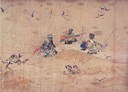ただいま現代語に変換中で、今年(2012年)の3月末には掲載できると思う。左は草むらに潜む家衡の兵士、右はそれを射る義家軍。