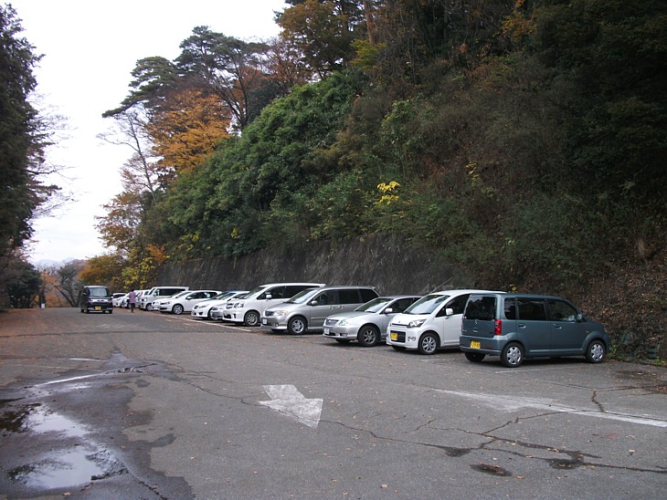 大手口前に聳える避来矢山は一部が削られて駐車場になった。頂上には武器庫などがあったらしい。