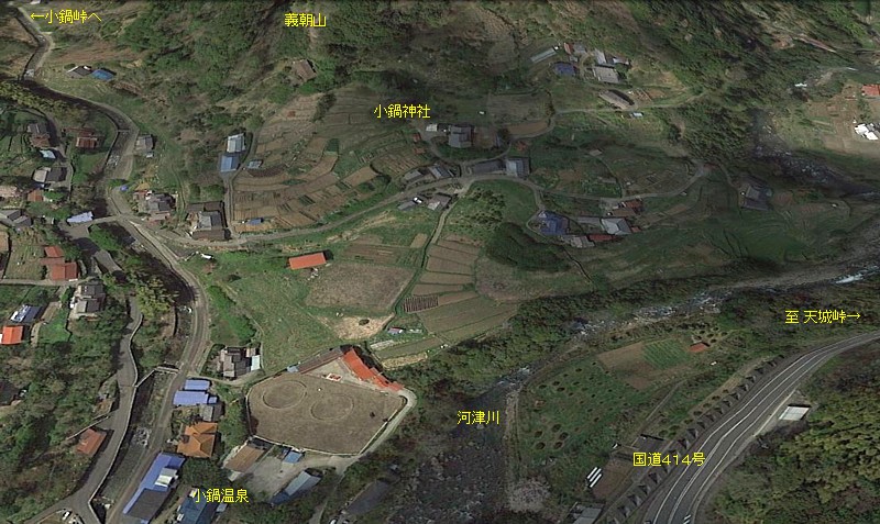 国道414号側から義朝山と小鍋神社を。旧下田街道は小鍋部落から峠を越えて南へ下る。