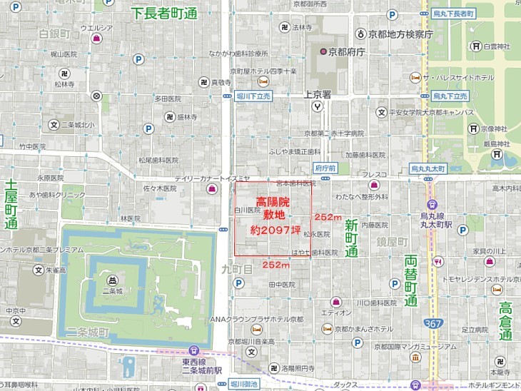 高陽院の位置図。旧内裏は約1.5km北西に内裏跡や豊楽殿の跡が保存されている。