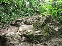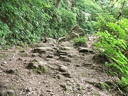 上: 海蔵寺側から登る化粧坂の山裾部分はゴツゴツした岩肌が続き、数日前に降った雨で滑りやすかった。騎馬で下るのは厳しい。