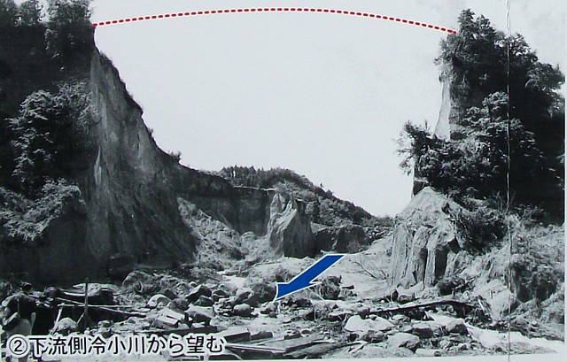 大見川上流の筏場、蛇喰(じゃばみ)山が崩落した現場近くに建てられた案内資料。