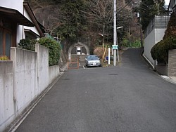 左: 鎌倉街道から300mほど先で道は山裾に消えていく。やがて私有地の奥で崖となり隧道の八幡宮側出口の上付近で途切れる。