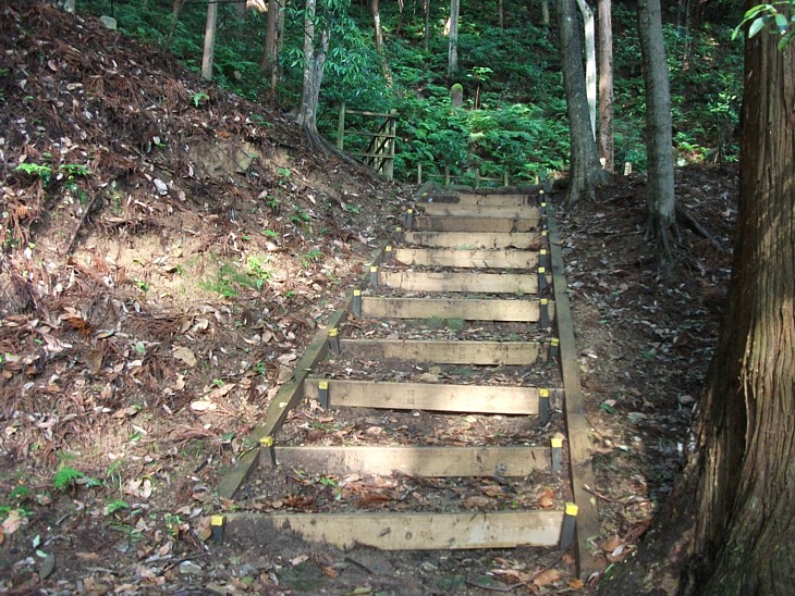 石段は20m程で途切れ泥の斜面になるが木板で土留めされて歩きやすい。雨が降ったらアウトだけどね。