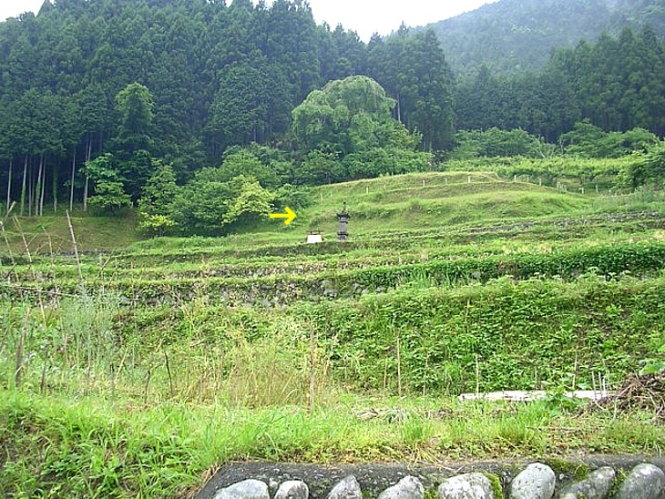 山裾の棚田に残る惟盛の墓の遠景。案内板もなく、JA支所横の急坂を登らねばならない。