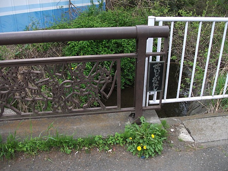 砂川堀南側の誓詞橋。こちらにも騎馬武者のレリーフがあるが、現在は風情に欠けるドブ川である。