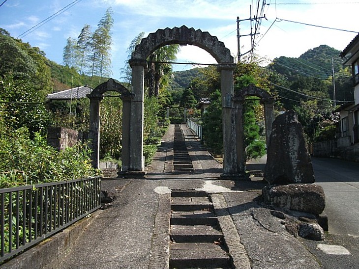 寺に似合わないアーチ型の石造り山門は明治時代初期の韮山県庁に使われていたもの。