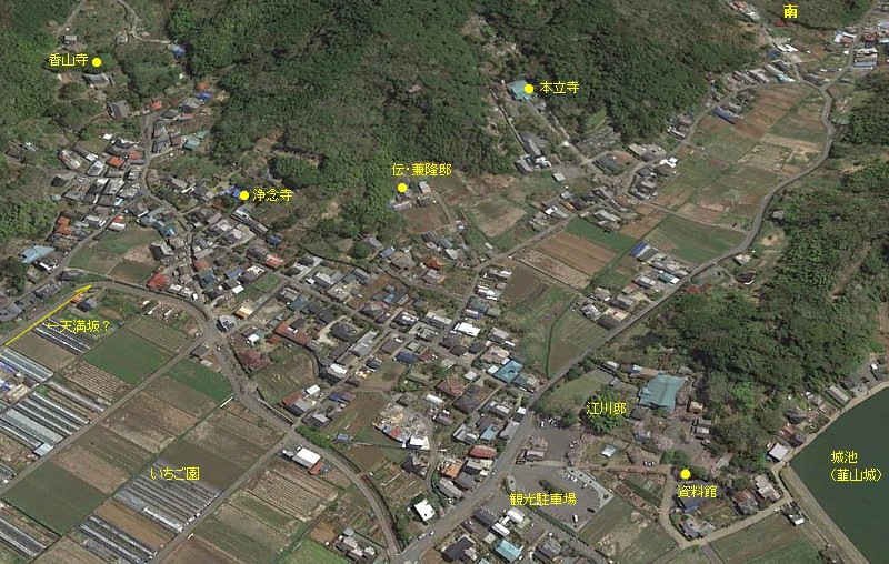 西側から見た香山寺と伝・兼隆館の一帯。二ヶ所の距離は直線にして約400m離れている。