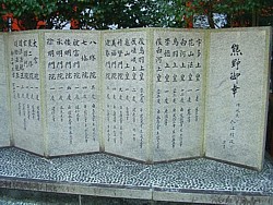 右: 入江・元侍従長の書による平安時代の天皇と皇族たちの御幸記録碑。もっとも多いのは 後白河法皇 の33回、後鳥羽天皇 の29回が続く。