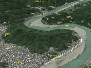 中: 本宮から500m離れた旧社地、現本宮の西側を流れる音無川と南西を流れる岩田川が合流していた中州・大斎原(おおゆのはら)へ。
