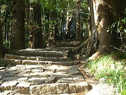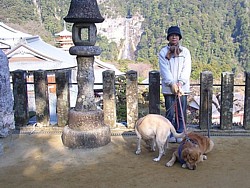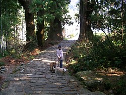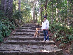 左: 三重塔の横を通って那智の滝つぼ近くまで下る。巾の広い石段は昔のままの姿なんだろうな。左側の隅には我が家の犬が待機中。