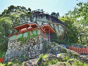 右: 速玉大社から1kmほど南の神倉山(120m)の絶壁に鎮座する神倉神社と御神体のゴトビキ岩。速玉大社の元宮または摂社とされる。