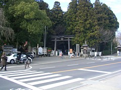 中: 参道前のスナップ。鳥居の向い側、消防署の横に広い無料駐車場がある。看板は初詣だが実際にはまだ12月29日、人出は少なかった。