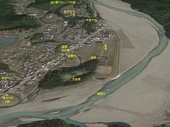 右: 本宮大社周辺の鳥瞰。昔の大斎原は面積1万1千坪の神域に五棟十二社の社殿が並び、現在の本宮大社の8倍も広かったと伝わる。
