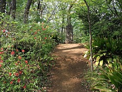 中: 左側は八国山遊歩道の入口に近い西宿公園の東京都指定旧跡・久米川古戦場碑。平成十年三月東京都教育委員会の建立による。