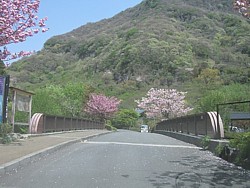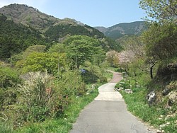 中: 舗装道路の右側が幕山の山裾を利用した梅林、左下には新崎川。所々に「蛇に注意」、川沿いには「マムシに注意」の看板が立つ。