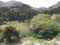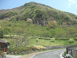 左: 城山の北東部分(左手)を見上げる。遊歩道から直線1500mほどの中腹に「しとどの窟」があるが、もちろん視認はできない。