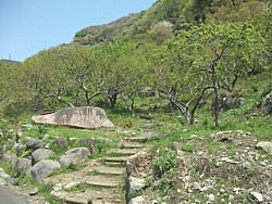 右: 梅林の標石と斜面を縫って伸びる遊歩道の入口。観光客の多い梅花の時期は手入れが行き届いているが、今回は夏草が結構繁っていた。