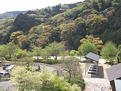 左: トイレ棟前から岩肌を見せる幕山に向う。ロッククライミングにも利用されている岩壁の山裾には広い梅林が続き、遊歩道が整備されている。