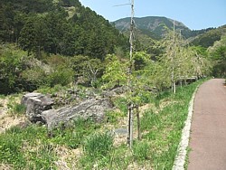右: 一説にはトイレ棟から500mほど上流で遊歩道が新崎川を渡る付近が堀口合戦場跡で、かつては数基の五輪塔があった、と伝わる。