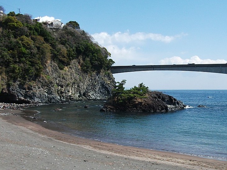 砂浜の50m先に弁天島、200m沖を高さ30mの真鶴道路(新道・200円)が横切る。