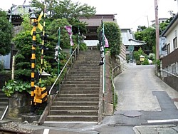 路地を左に登ると家並みスレスレを走る線路の先が境内で、車の場合はそのまま坂を登れば余裕のある駐車場が設けられている。