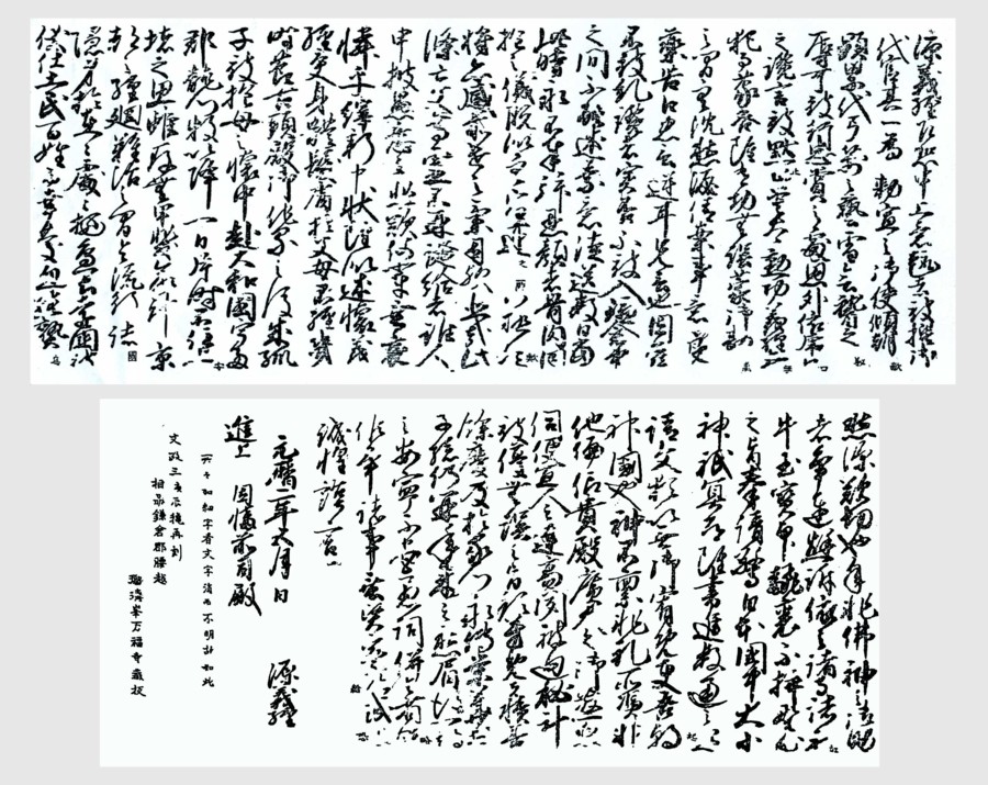 満福寺に収蔵されているのは文政三年(1820)に彫られた版木による刷り物で、義経から大江廣元を経て頼朝に届いた書状はもちろん残っていない。この手紙を書いたのは義経祐筆の中原信康だとか、原案は
