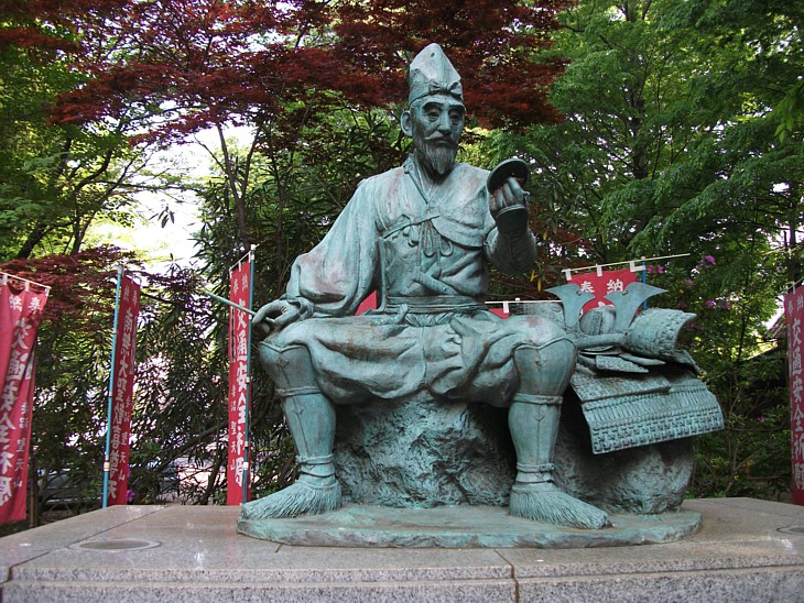 参道右手の實盛銅像。鏡を持ち筆を握っているのは出陣前に髪を染める姿を想定している。