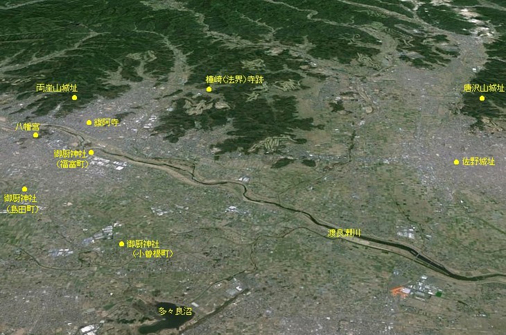 小曽根町と島田町の御厨神社は約5km、島田町と福富町の御厨神社は約2km(共に直線)離れている。