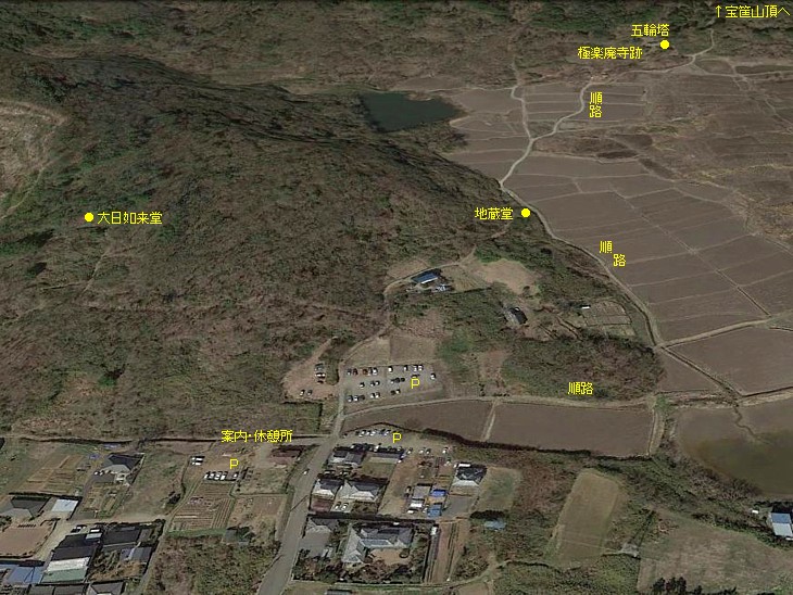 三村山極楽廃寺周辺の鳥瞰図。駐車場から五輪塔までは約700m、山裾と水田に沿って平坦な農道を歩く。