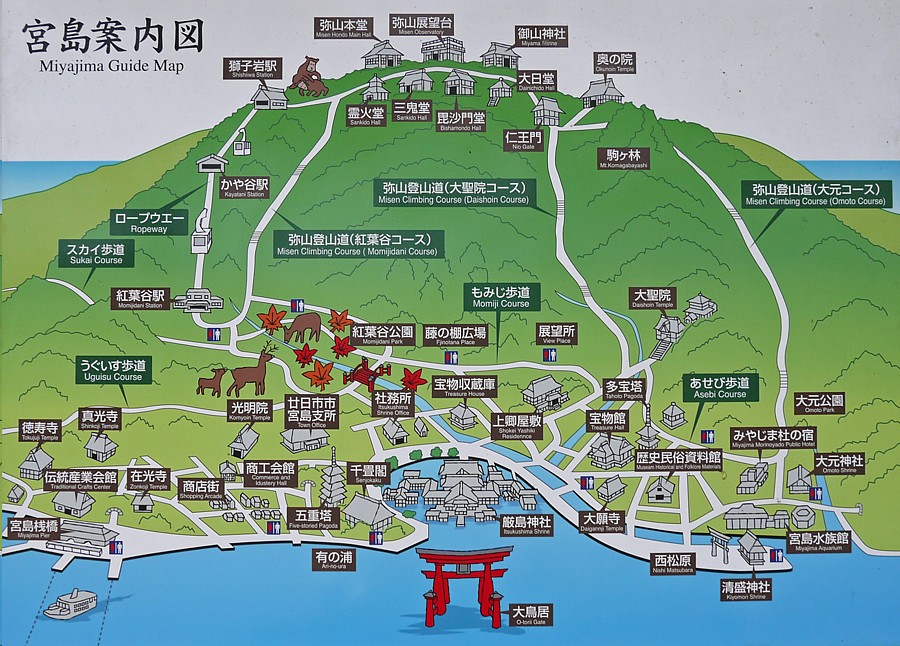 大鳥居の上空から見た宮島と厳島神社。創建は推古天皇元年(593)、平家一門の守護神である。