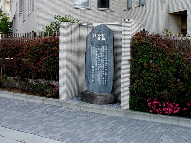 鎌倉駅の西口近く、今小路の南に向いて建つ問注所跡の石碑