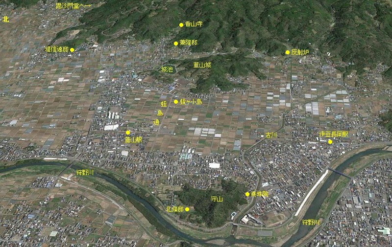 田方盆地の西端、守山上空から見た山木館の方向。第一次攻撃隊は狩野川に沿って北へ迂回した。