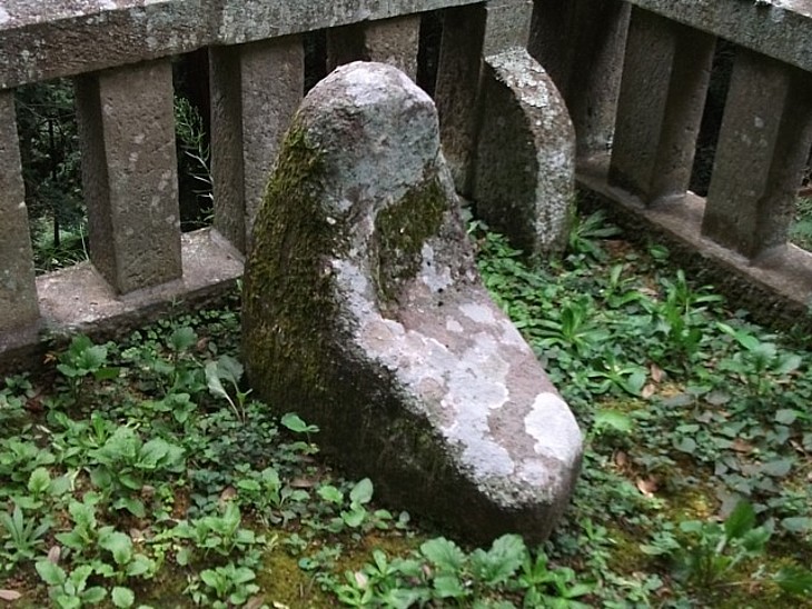 本殿前に残る異形の石は縦横とも約50cmで素性は不明、既にそれを確かめる術もない。