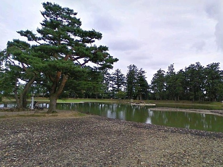 鐘楼跡の近くから、中島と対岸の石組み・立石の方向を。