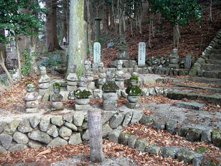 本堂の左手奥に妙雲禅尼の石塔への石段、手前に二つの墓標と数個の五輪塔が並ぶ。左方向が墓苑。