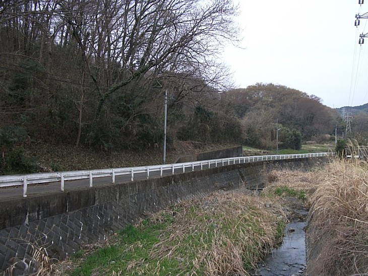 椿河原川から丘陵を撮影。300mほど上流から丘陵沿いに一周できる農道が通じている。