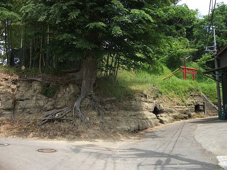 丘陵の東を走る道路の南端部分。道路が狭いから北側の空き地に駐車する方が無難か。