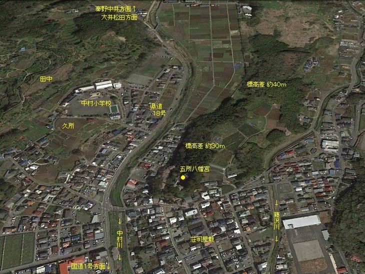 館跡推定地の一つ、五所八幡宮。中村川と藤沢川に挟まれた独立峰の南端に位置する。