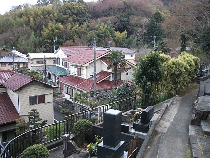 朝忠夫妻と曽我兄弟の墓所は墓苑の一番奥、吾妻山に切り込んだ谷戸の傍らに位置する。