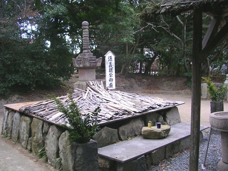 木太刀が積まれた義朝廟所。首は長田忠致が持ち去ったため亡骸だけを葬った胴塚である。