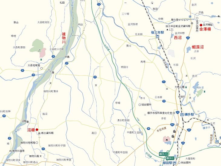 清衡の家族を殺し豊田館を焼いた家衡が立て籠った沼の柵と、彼らが滅亡した金澤の柵の位置。