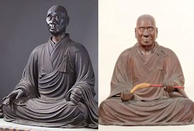 右: 左は教理を重視し布教に尽力した興正菩薩叡尊上人座像 (奈良西大寺収蔵) 、右は非人や病人の救済を軸に東国での布教を目指した忍性菩薩座像 (鎌倉極楽寺収蔵)。