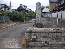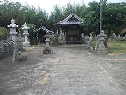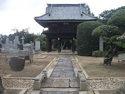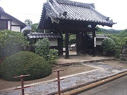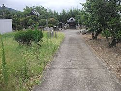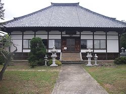中: 本堂は享保十七年 (1732) の建立で正面は八スパン、偶数間のため入口を右にずらして作っている。左右に大小2組の石灯籠を置いた姿も珍しい。