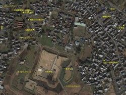 右: 城址の構造を表示した鳥瞰画像。かつての筑波鉄道が城址のど真ん中を貫くという恐ろしい状態だったことが確認できる。さすがに自転車道路は城址の外郭に