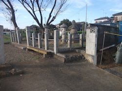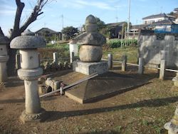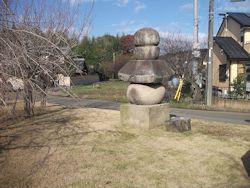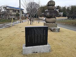 中: 南に開けた斜面を見渡す高台に大型の五輪塔が一基と、両側に小型の五輪塔が数基。手前右に駐車できる空き地がある。墓所横の碑文は以下の通り。