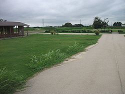 左&中: 自転車道路の奥に見える手前にサブ駐車場があり、隣接する芝生広場には巨大な五輪塔が置かれている。元々は小田城の南側土塁上の鐘楼跡から移設した