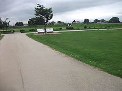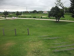 中: 突き当りのT字路奥が建物域とされているが只の芝生広場状態、正面に遺構の配置図看板、奥の土塁に旧筑波鉄道が城址を横切っていたトンネル部分が見える。