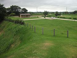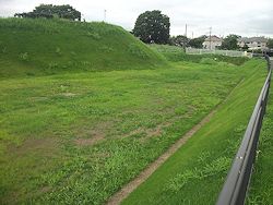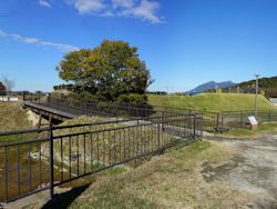 右: 南東の展望台から土塁の上を西へ、サイクリング道路の先に馬出し (虎口の外側を守る曲輪) 部分が見える。戦国時代の周辺は湿地帯だったと伝わる。