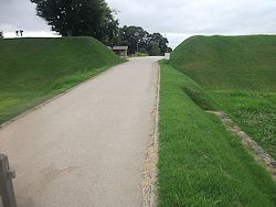 左: 案内所を過ぎて城跡の土塁に接近。線路の跡は土塁を突き抜けて城跡へ、このトンネル部分に遺構の展示室とトイレがあり、自転車道は右折して城址の東側を